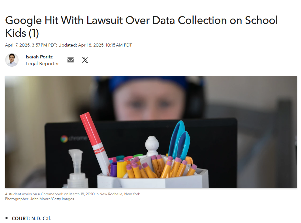 The tech giant collects not only traditional education records “but thousands of data points that span a child’s life,” and “neither students nor their parents have agreed to this arrangement, according to the US District Court for the Northern District of California complaint.  (Source:  BloombergLaw.com - Read more ...)