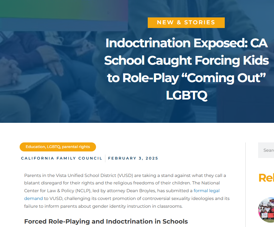 Parents in the Vista Unified School District (VUSD) are taking a stand against what they call a blatant disregard for their rights and the religious freedoms of their children. The National Center for Law & Policy (NCLP), led by attorney Dean Broyles, has submitted a formal legal demand to VUSD, challenging its covert promotion of controversial sexuality ideologies and its failure to inform parents about gender identity instruction in classrooms.  (Source:  California Family Council -- Read more ...)