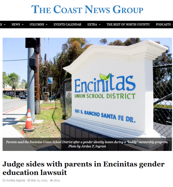 A federal judge has granted a request for a preliminary injunction prohibiting the Encinitas Union School District’s buddy program from teaching gender identity topics without first notifying parents and allowing them to withdraw their children from the lesson.  (Source:  The Coast News Group -- Read more ...)