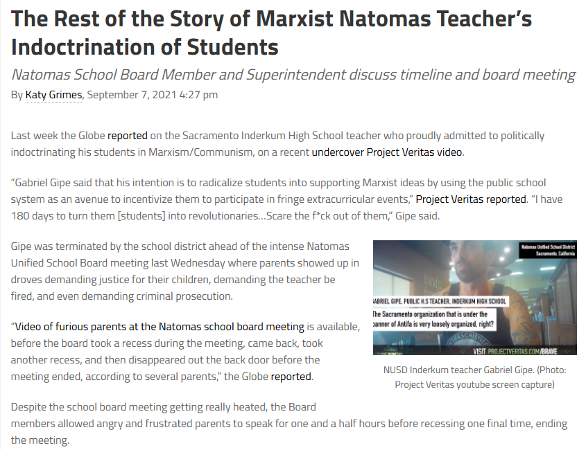 ... the Globe reported on the Sacramento Inderkum High School teacher who proudly admitted to politically indoctrinating his students in Marxism/Communism, on a recent undercover Project Veritas video.