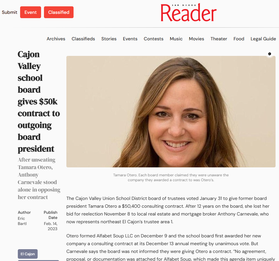 The Cajon Valley Union School District board of trustees voted January 31 to give former board president Tamara Otero a $50,400 consulting contract. After 12 years on the board, she lost her bid for reelection November 8 to local real estate and mortgage broker Anthony Carnevale, who now represents northeast El Cajon’s trustee area 1.  (Source:  San Diego Reader - Read more ...)