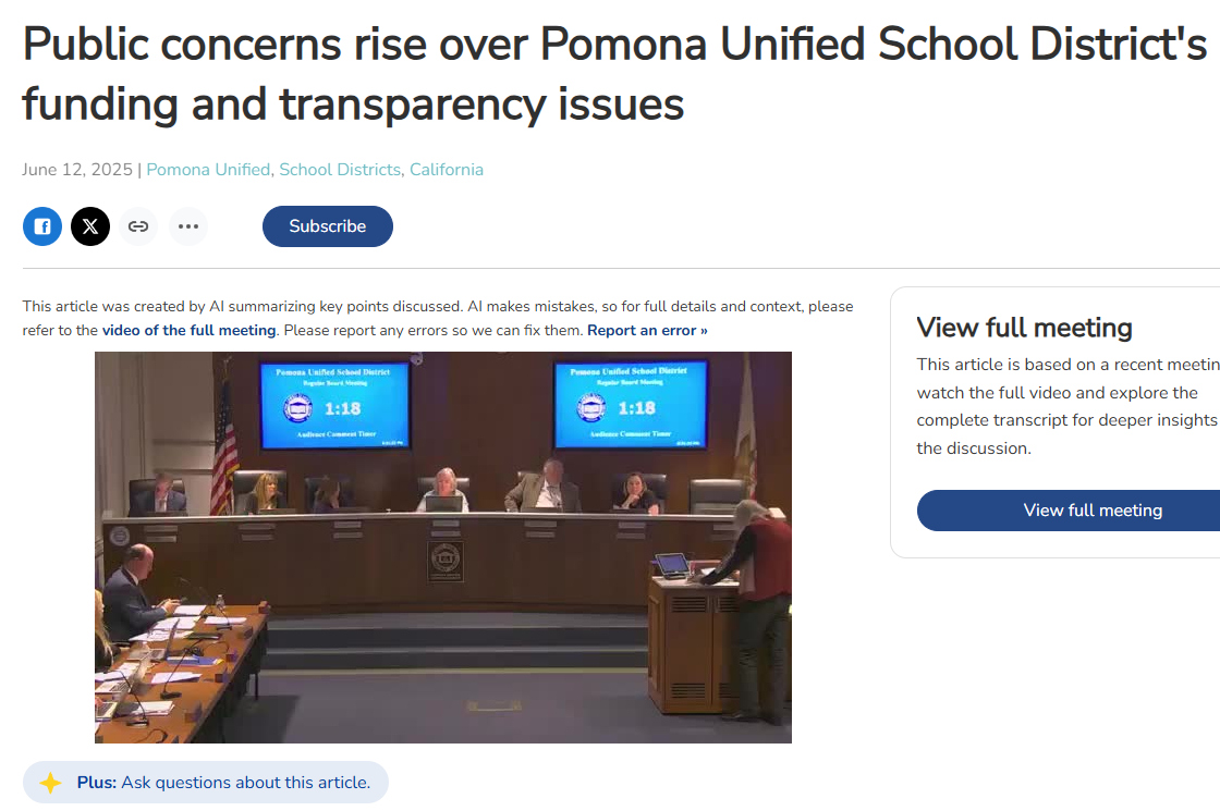 The Pomona Unified School District (PUSD) Board meeting on June 11, 2025, highlighted significant concerns regarding transparency and fiscal management within the district. Community members voiced urgent calls for accountability, particularly in light of the district's handling of substantial bond measures totaling nearly $920 million over the past 16 years.  (Source -  CitizenPortal.ai -- Read more ...)